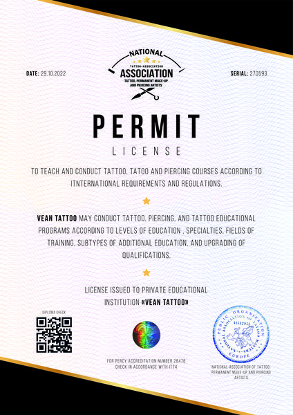 Obținerea unui certificat este etapa finală a programului. Certificatul pe care îl veți primi la studioul „VEAN”, confirma disponibilitatea cunoștințelor și aptitudinilor necesare activității profesionale independente in domeniul tatuajului. Oferim absolvenților noștri posibilitatea de a obține un post de artistă tu autor într-unul dintre studiourile din rețeaua “VEAN”. Toți studenți primesc asistență înțeleg tare echipamentelor instrumentelor și consumabilelor.
