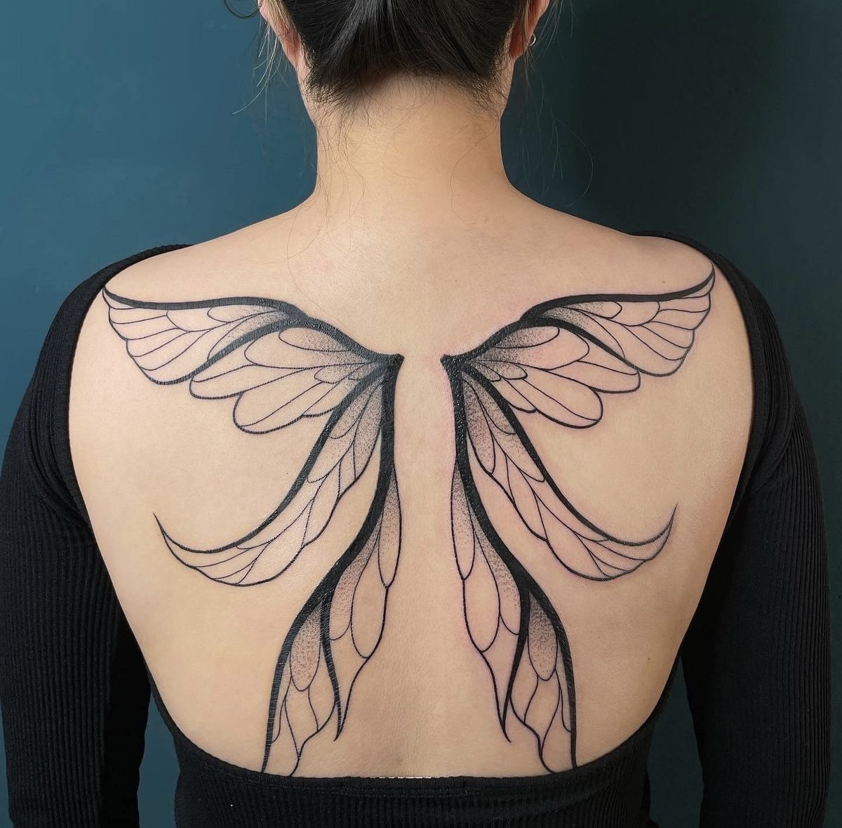 - Aripile – fie angelice, fie de pasăre – transmit dorința de libertate, dezvoltare spirituală și protecție. Aceste tatuaje creează efectul de zbor, acoperind întregul spate.