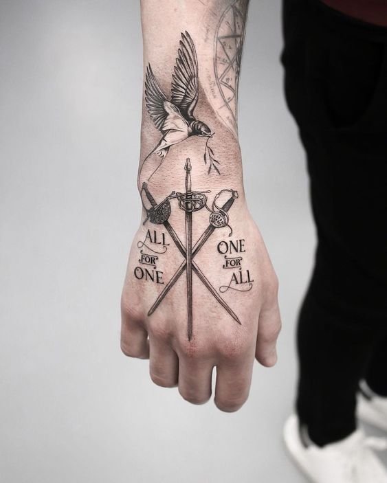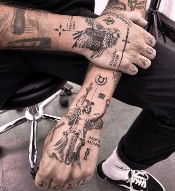 - Ieroglife și cuvinte: Pe pumnii sunt adesea văzute ieroglife sau cuvinte care exprimă trăsături personale, cum ar fi „forță”, „credință” sau „voință”. Aceste tatuaje servesc ca un memento al convingerilor interioare sau principiilor de viață ale posesorului lor. Spre deosebire de imagini mai mari, cuvintele sau frazele scurte pot fi concise, dar puternice în mesajul lor.