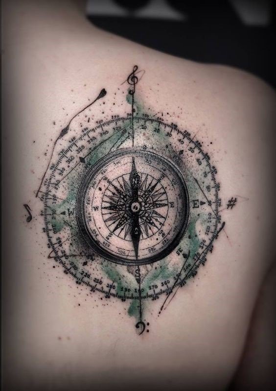 - Spate: Dacă preferi tatuajele mari și detaliate, spatele este pânza ideală pentru a crea un design complex și stratificat al busolei, completat de alte elemente, precum o hartă a lumii sau un vapor.