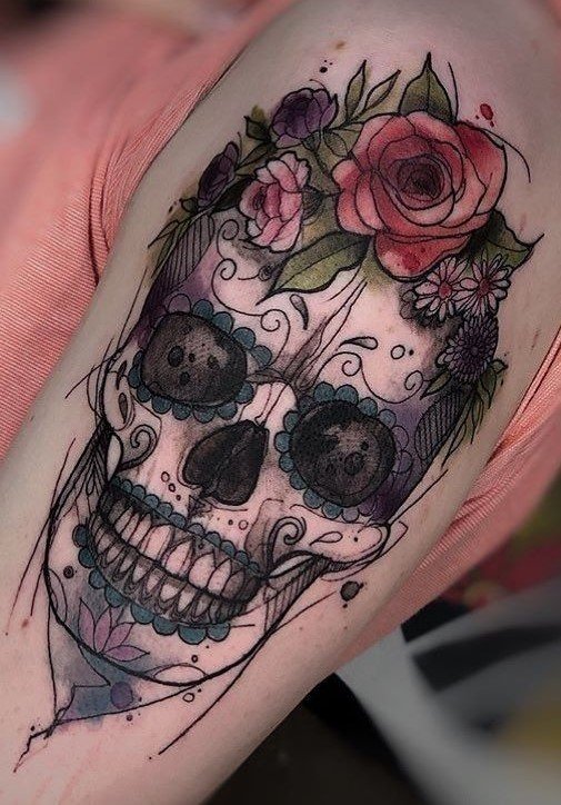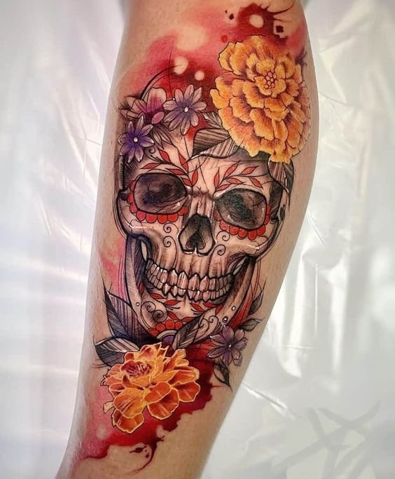 - Craniu de Zahăr (Calavera): În cultura mexicană, craniile de zahăr sunt un simbol al Zilei Morților. Aceste tatuaje sunt de obicei colorate și decorate cu motive florale și modele.