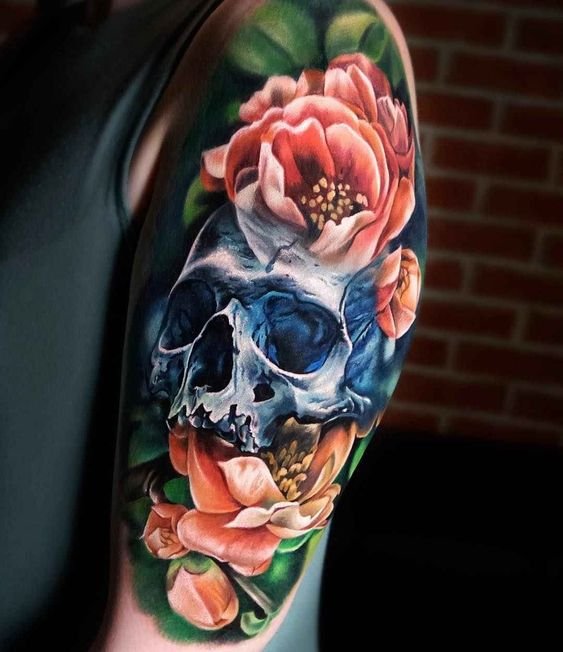 - Craniu cu Flori: Combinația dintre un craniu și flori, cum ar fi trandafirii sau crinii, simbolizează contrastul dintre viață și moarte. Aceasta poate fi o imagine realistă sau stilizată.
