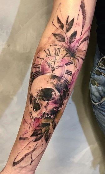 - Acuarelă: Tatuajele în stil acuarelă arată ca picturi, cu tranziții de culoare moi și contururi estompate. Craniul în acest stil poate fi completat cu culori vii, creând impresia unei picturi.