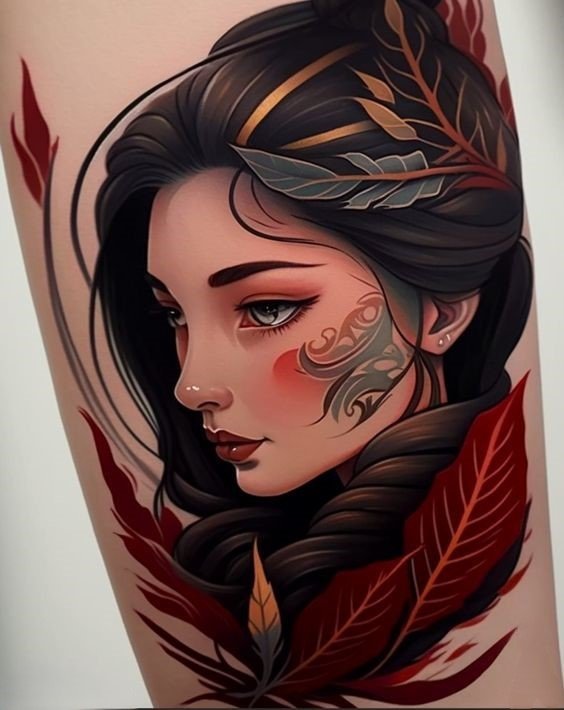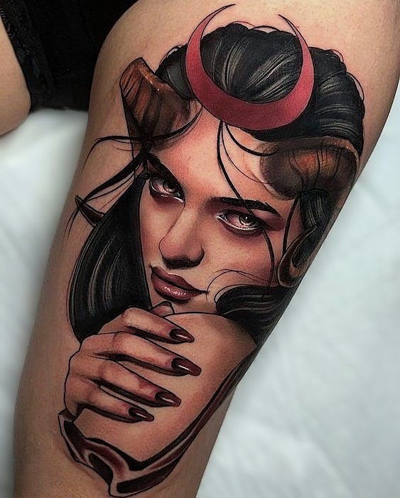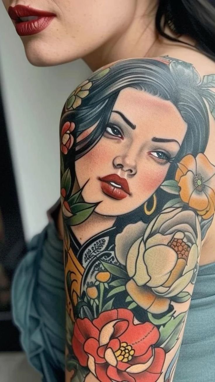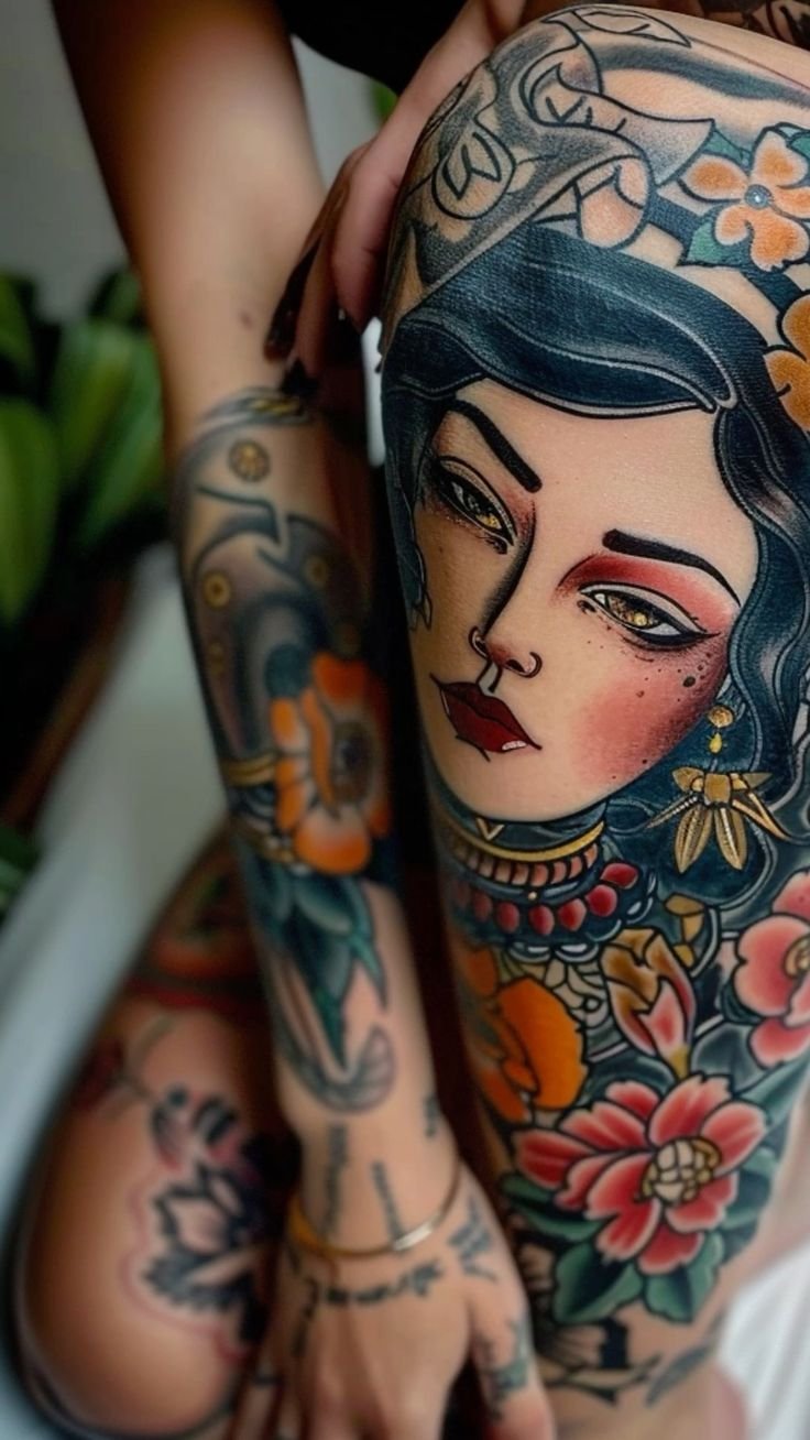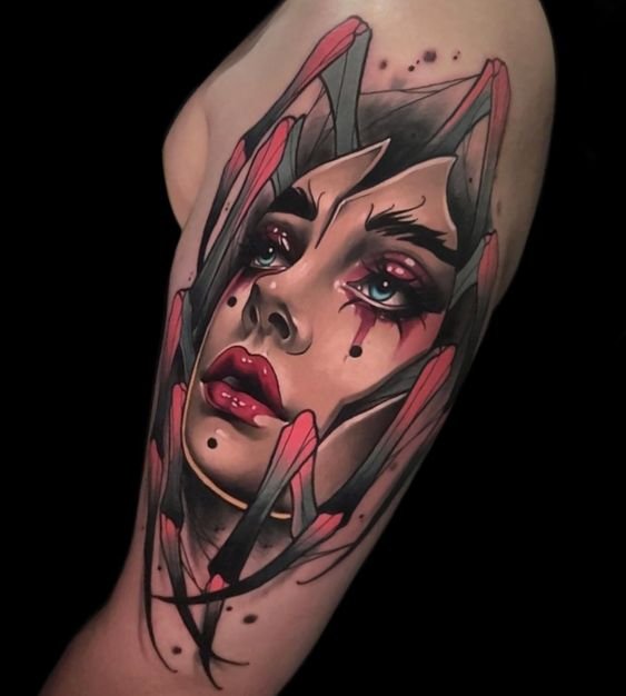 - Tatuajele dama în stil neo-tradițional sunt imagini pline de culoare și contrast. Adesea includ elemente decorative, flori și forme geometrice care creează o imagine atrăgătoare și memorabilă. Acest stil poate reda atât romantismul, cât și îndrăzneala, în funcție de paleta de culori și detalii. Un tatuaj dama în stil neo-tradițional simbolizează adesea dorința de a ieși în evidență și de a sublinia unicitatea printr-o estetică aparte.