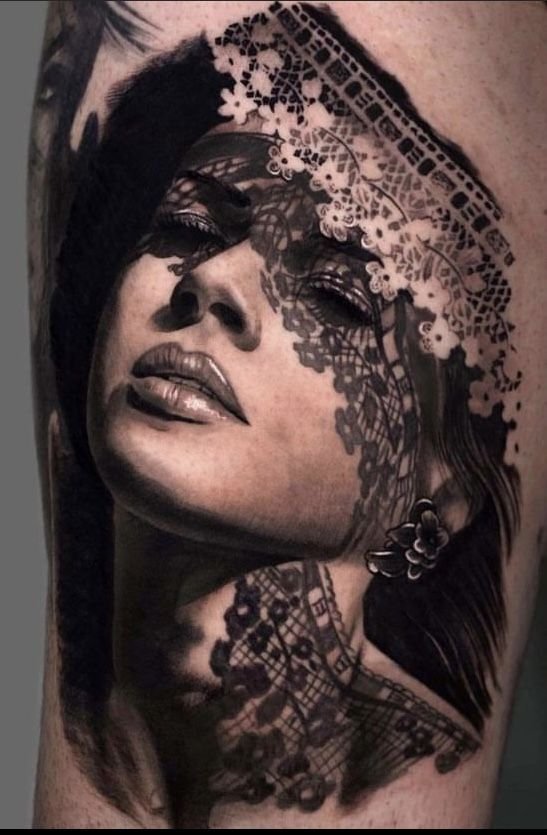 - Unul dintre cele mai căutate stiluri pentru tatuaj dama este realismul. Datorită detaliilor fine, astfel de tatuaje par vii și autentice, asemenea unei fotografii. Ele permit redarea trăsăturilor fine ale feței, emoțiilor și texturii. Imaginea realistă a unei femei în tatuaj reflectă unicitatea persoanei și subliniază aspectele importante ale vieții și caracterului acesteia.