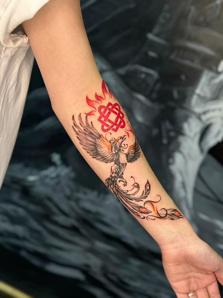 Phoenixul este personificarea renașterii. Capacitatea sa de a renaște după auto-incendiere simbolizează o nouă viață după încheierea celei vechi. Acest desen este potrivit pentru persoanele care au trecut prin schimbări semnificative sau vremuri dificile și doresc să marcheze începutul unui nou capitol în viața lor.