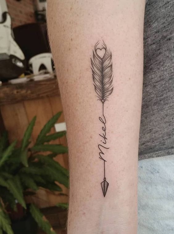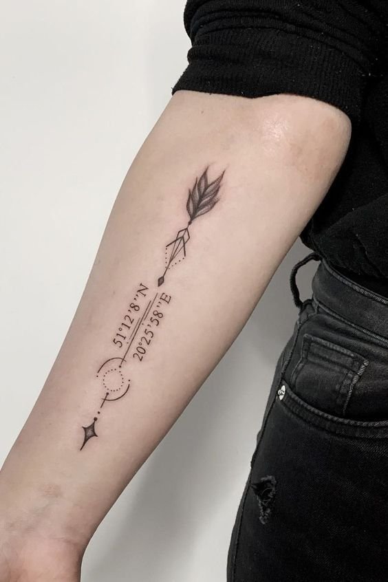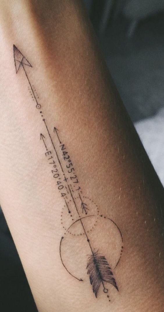 - Legătura între trecut și viitor. În unele culturi, săgeata simbolizează legătura între trecut și viitor. De exemplu, în cultura indigenă nord-americană, săgeata poate reprezenta calea sufletului sau conexiunea între strămoși și descendenți. Aceste tatuaje pot avea un sens spiritual sau religios profund.