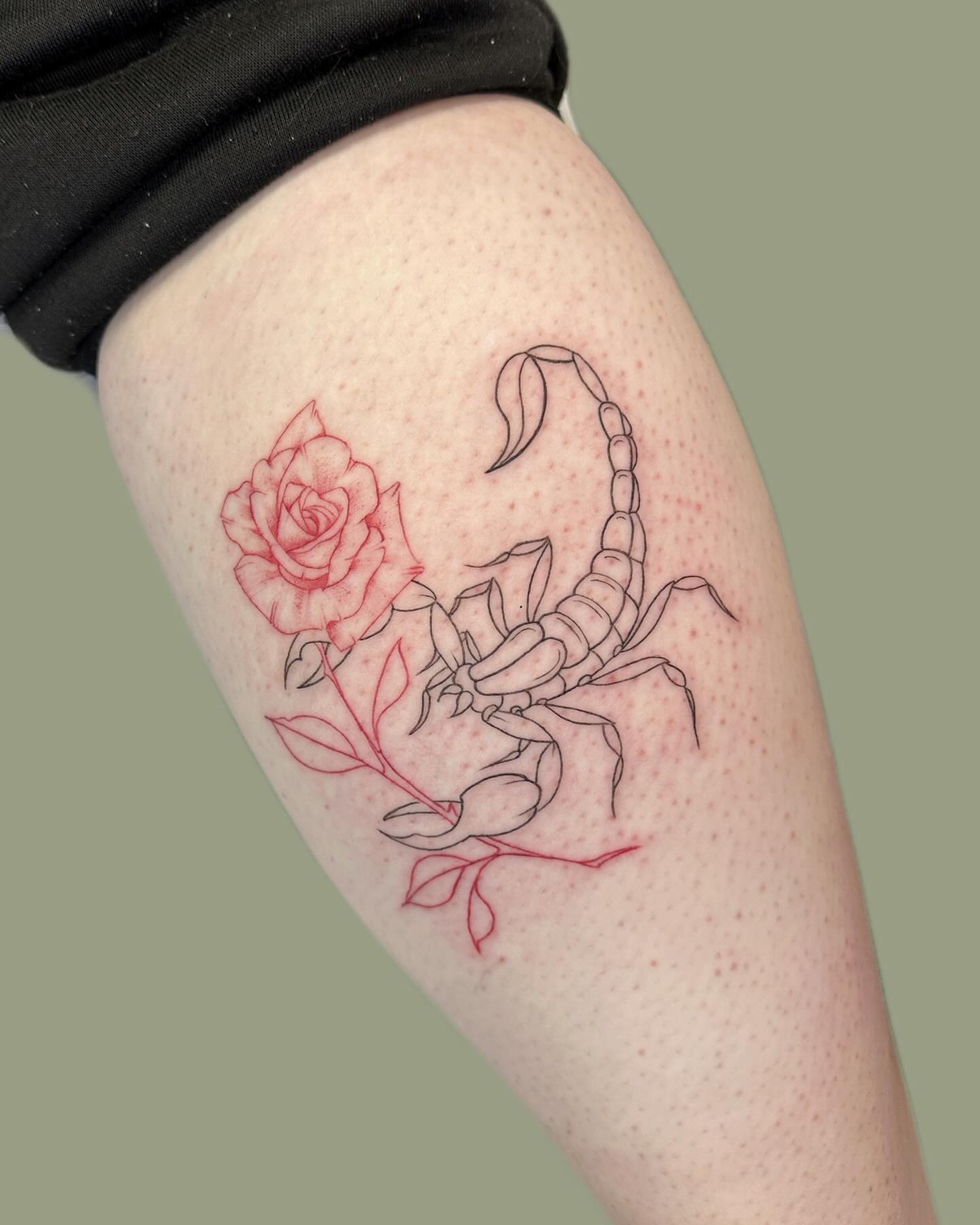- Minimalism: Desene simple și concise care accentuează forma și silueta scorpionului, ideale pentru cei care preferă reținerea și eleganța. Tatuajele minimaliste folosesc adesea un număr minim de linii și culori, dar reușesc să transmită esența și caracterul scorpionului. Acest stil subliniază nu atât frumusețea exterioară, cât mai ales conținutul interior și simbolismul, concentrându-se pe profunzimea și înțelepciunea ascunsă în această creatură enigmatică.