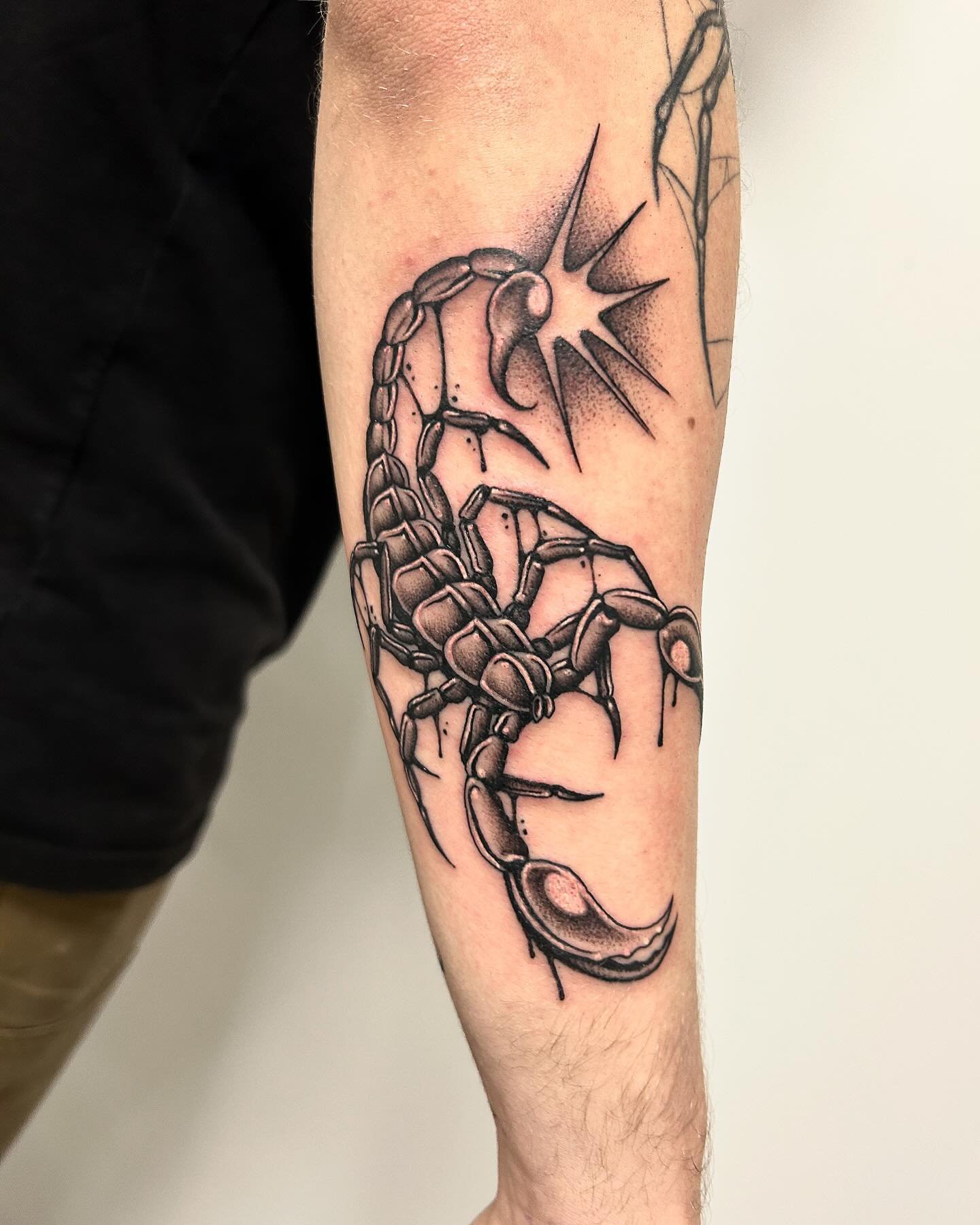 - New School: Imagini vii și caricaturale, pline de culoare și expresie, aduc în tatuaj un element de joc și originalitate. Stilul New School se caracterizează prin forme exagerate, culori saturate și linii dinamice, făcând fiecare tatuaj o operă de artă unică. Tatuajele în stilul New School cu scorpioni adesea conțin elemente de fantezie, umor și ironie, permițând astfel purtătorului să își exprime individualitatea și viziunea neconvențională asupra lumii.