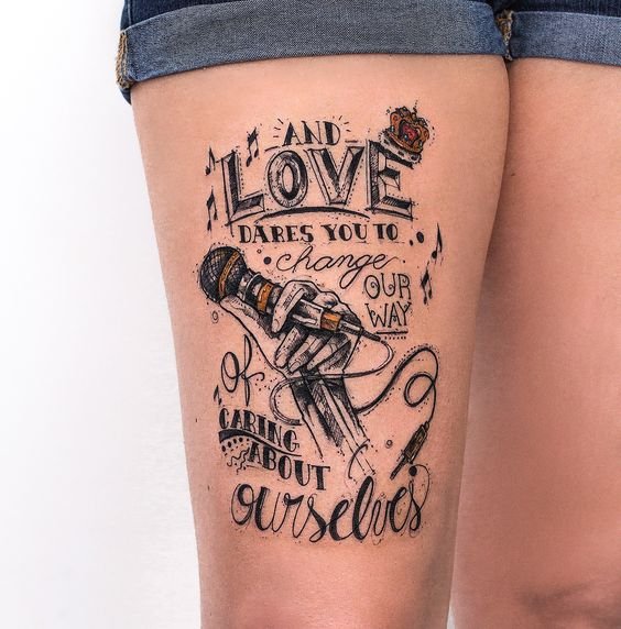 - Citate din melodii: Lirica care spune mai multe despre tine decât o mie de cuvinte. Alege un vers din melodia ta preferată care are o semnificație specială pentru tine și gravează-l pe piele.
